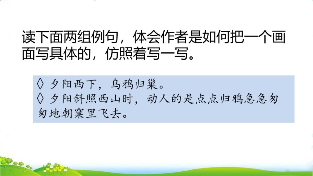 (2)夕阳斜照西山时,动人的是点点归鸦急急匆匆地朝窠里飞去。