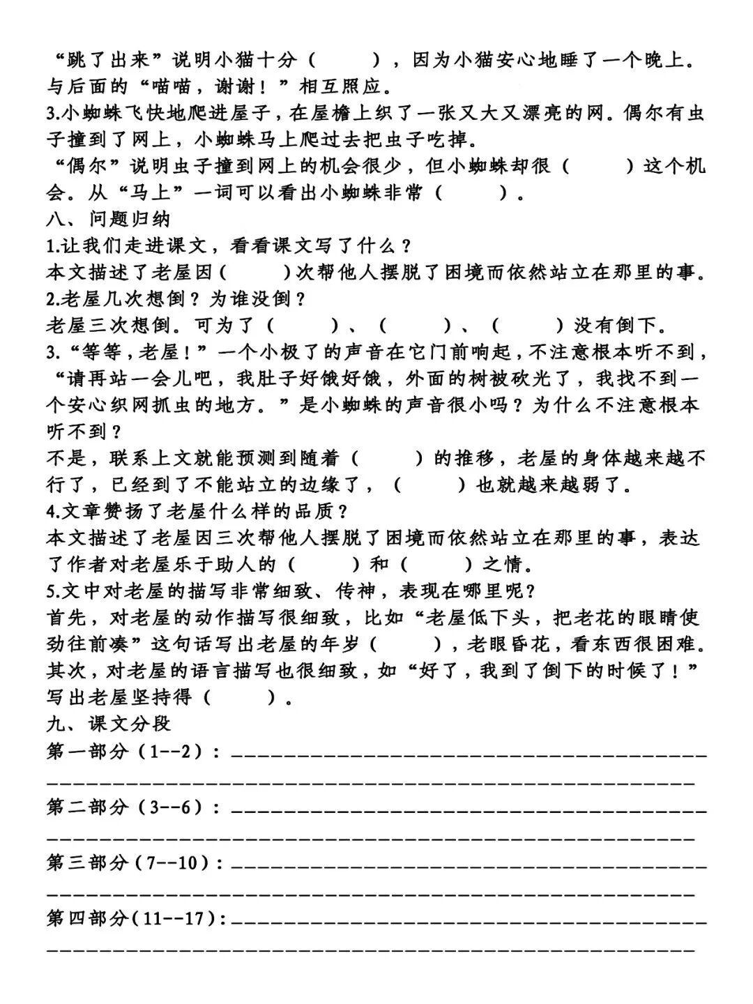 第四部分(11--17):小蜘蛛需要在老屋里织网,老屋同意了,后来老屋一直听小蜘蛛讲故事,至今也没有倒下。