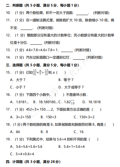 人教版数学五年级(上)期中精卷附答案,11套,免费下载