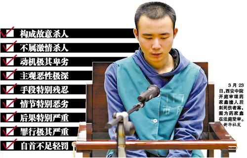 于是,他掏出了随身携带的一把尖刀,长约二三十公分,对张妙的胸、腹、背部等,处连续捅刺数刀。弹钢琴的手,成了残忍的杀手,这就是轰动全国的“药家鑫杀人案”。有人分析说,在处理车祸这个突然出现的危机时,药家鑫做出了逃避,这种是由软弱和自私心理构成的最差的行为反应。过于软弱,不敢承担,与父亲过于严格的家庭教育方式不无关系。@“我现在想的是对孩子太严格了,太严厉了,因为他可能出了这么大的事害怕了。”