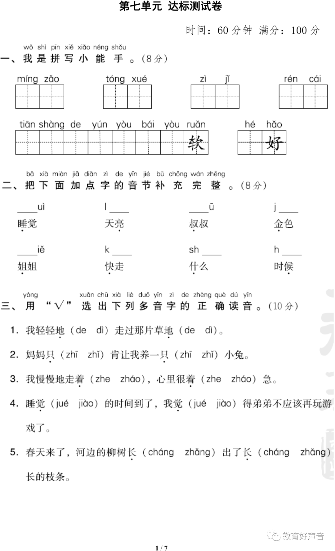 今天,话筒君老师分享给大家的是:统编版语文1年级(上册)第7单元精品试卷、答案,可打印。由于版面有限,仅展示其中一套试卷。