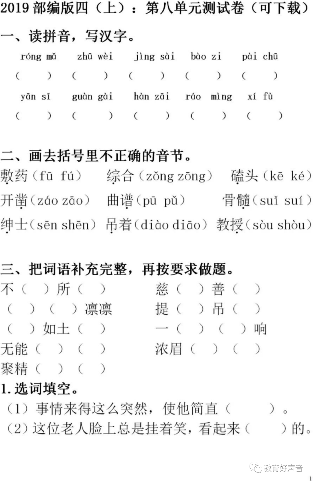 今天,给大家整理了最新部编版四年级语文上册第八单元测试卷,总共4套,请各位家长领取电子版打印给孩子练练,更好的巩固第八单元的知识点,查漏补缺,备战期末!