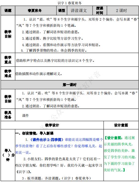 1.正确认读本课“霜、吹、落”等8个生字,会写田字格里的“春、风、冬”等7个生字。2.学生自主识字,养成良好的写字习惯;初步了解四个季节的自然现象。师:今天我们就来认识春、夏、秋、冬四个季节及其相应的自然现象。 (1)用自己喜欢的方法读课文,同时用曲线在文中标出生字词。(2)同桌交流,再读课文,借助拼音扫除字词障碍。(自读、小组读、分段读)(1)出示生字卡片,“霜、吹、落、降、飘、游、池、入”指名读。(1)出示我会写的7个生字: “春、风、冬、雪、花、飞、入”,指名认读、领读。2、谁能说出春、夏、秋、冬四个季节最具代表性的自然现象?(教师可引导提示,最终说出:春风、夏雨、秋霜、冬雪)