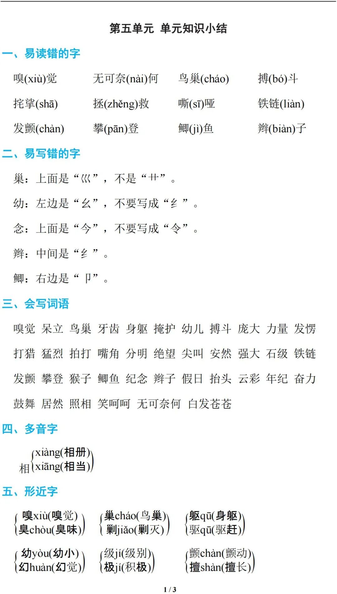 2021统编版语文(上册)四年级第五单元知识小结(可下载打印)