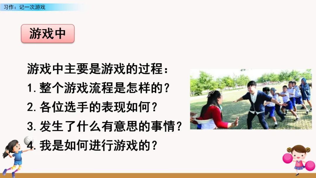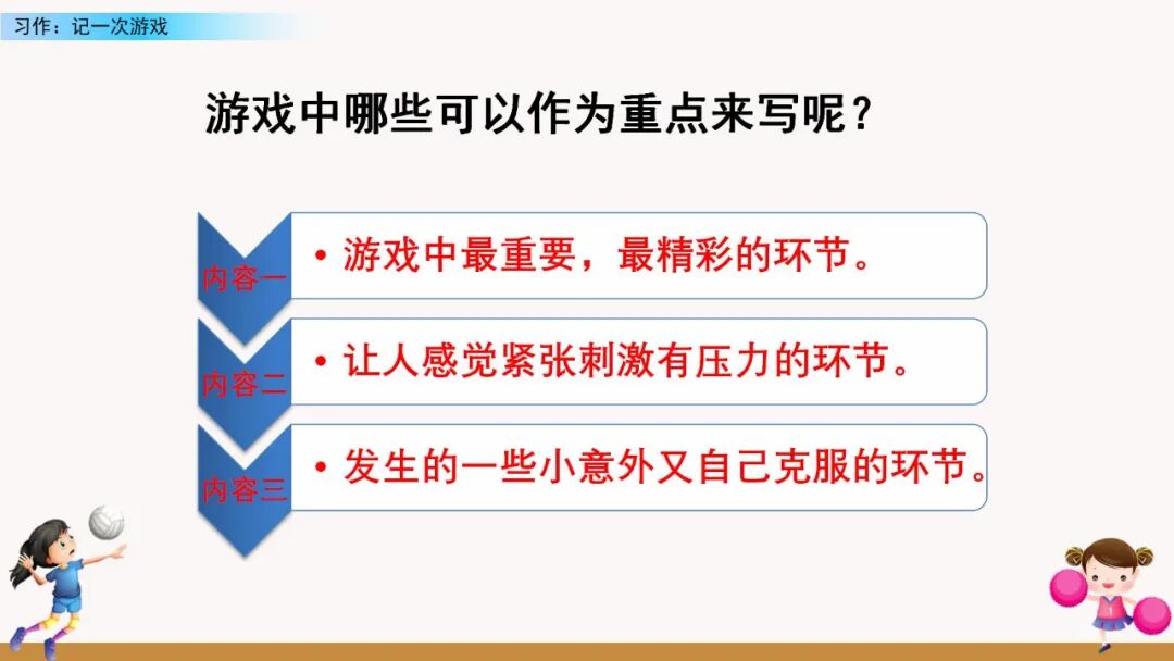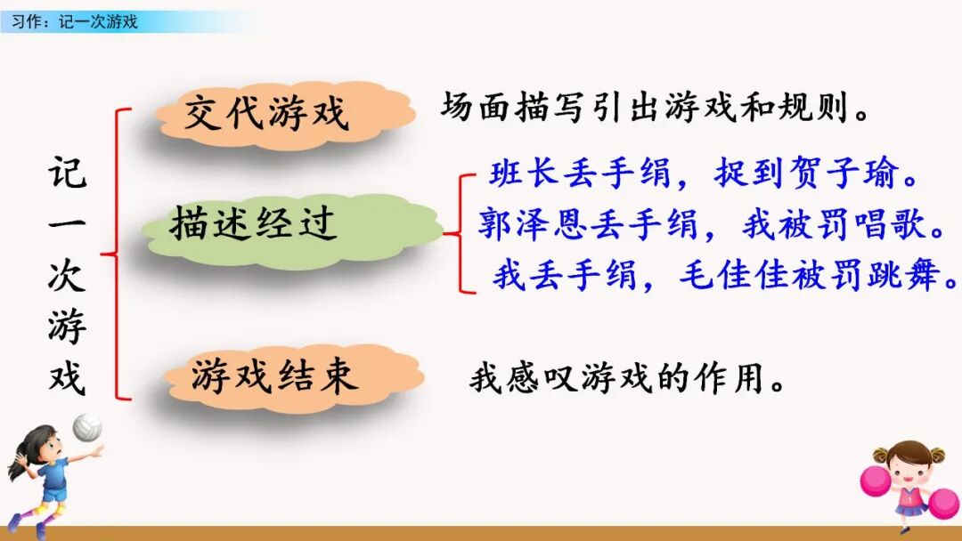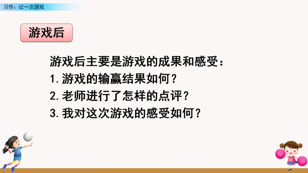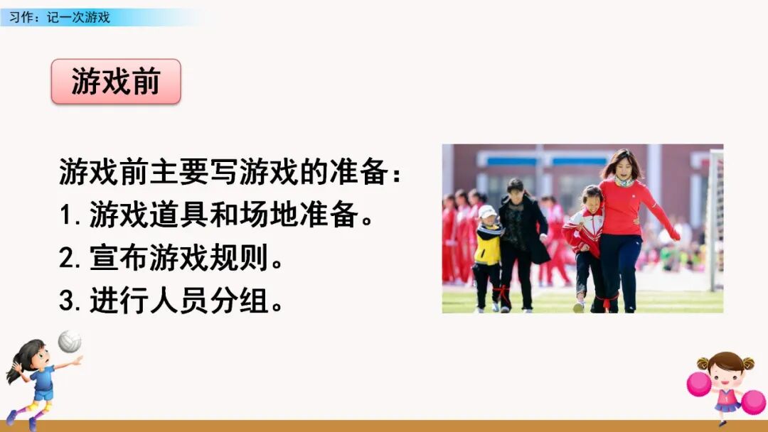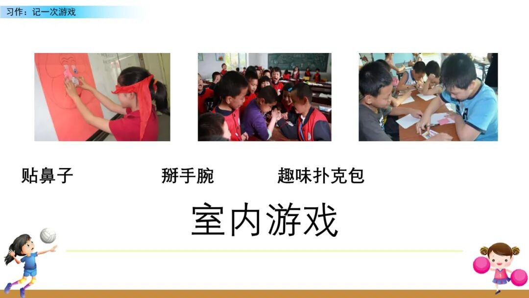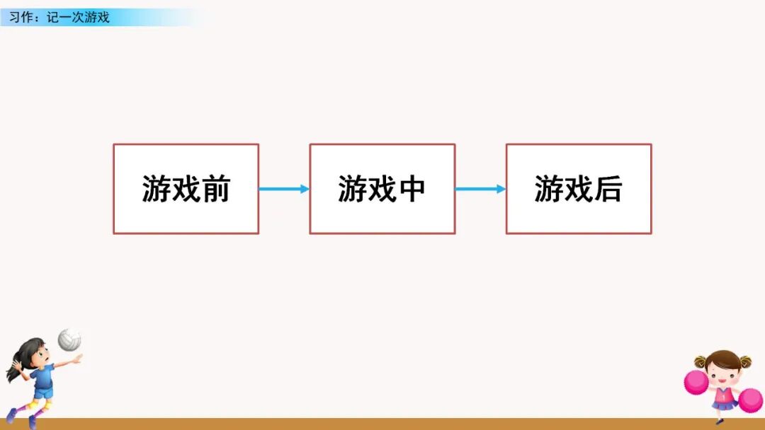 写作时可以按照游戏前、游戏中、游戏后的顺序来描写,把游戏的过程写清楚。