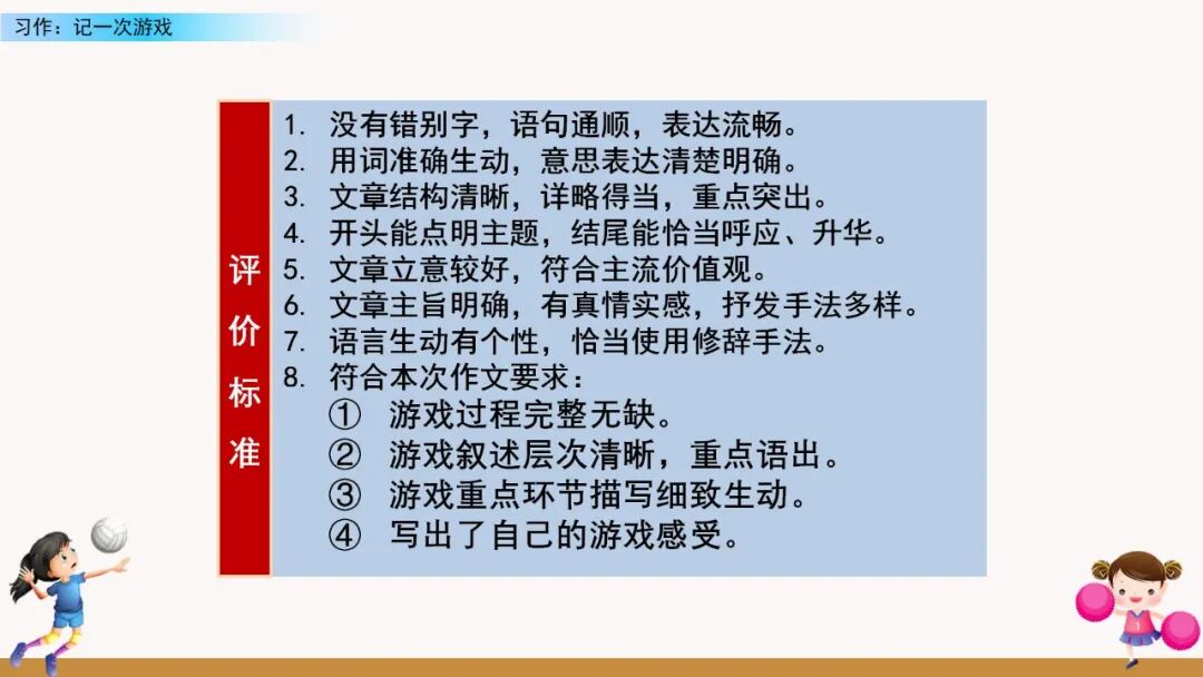 本次作文是记一次游戏,这个游戏可以是室内的,也可以是室外的;可以是传统游戏,也可以是新游戏;还可以写以前和其他人一起玩过的游戏。