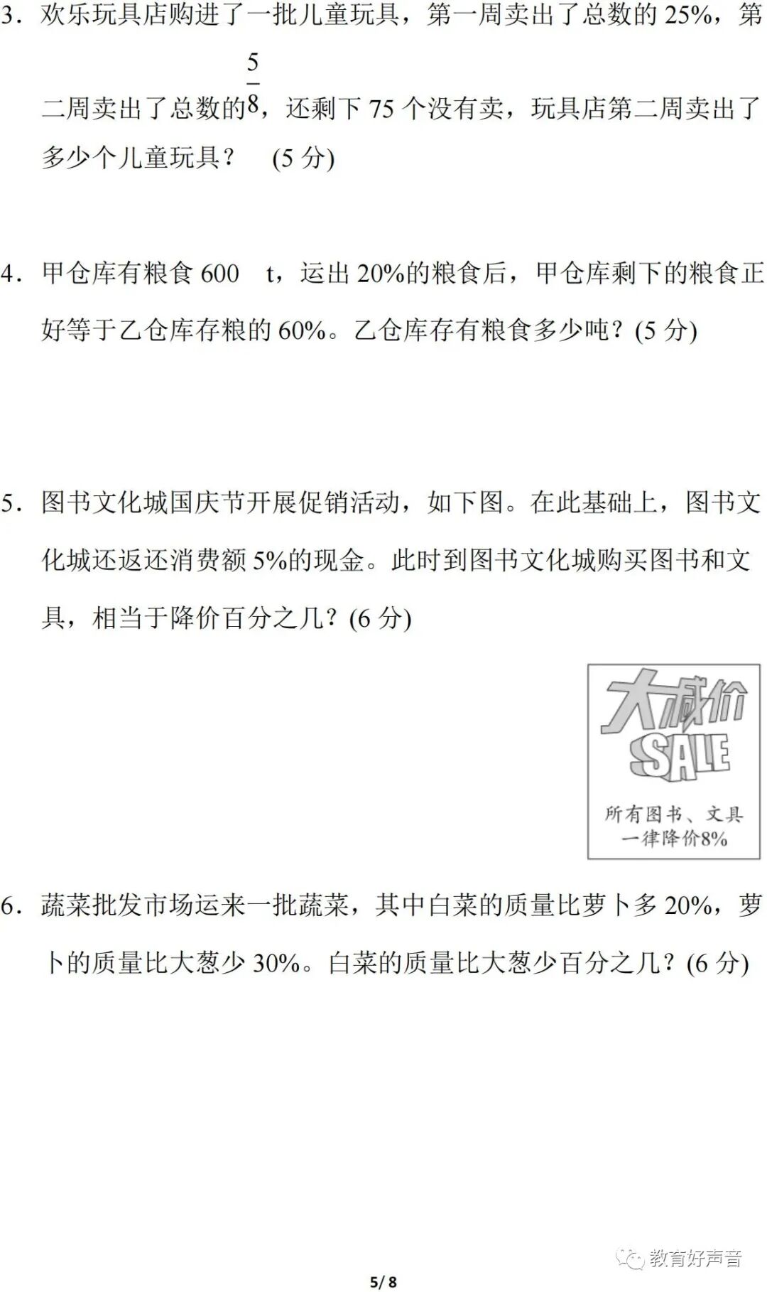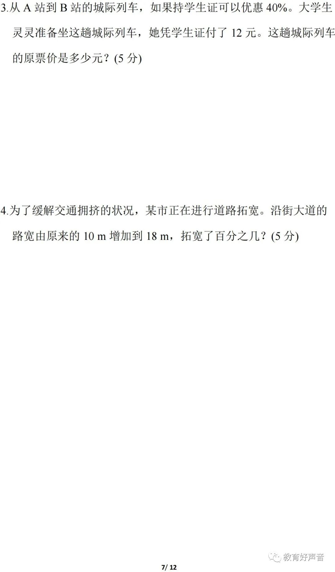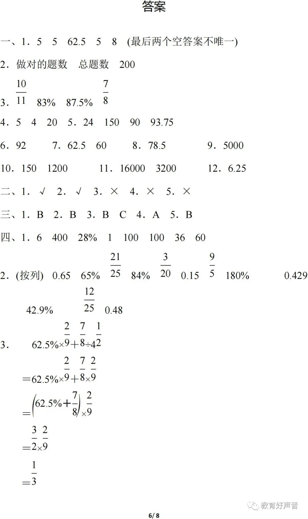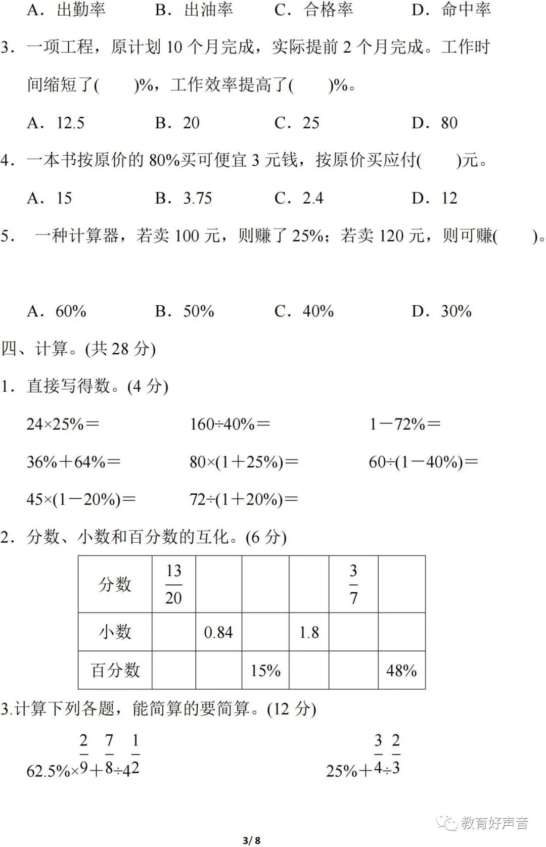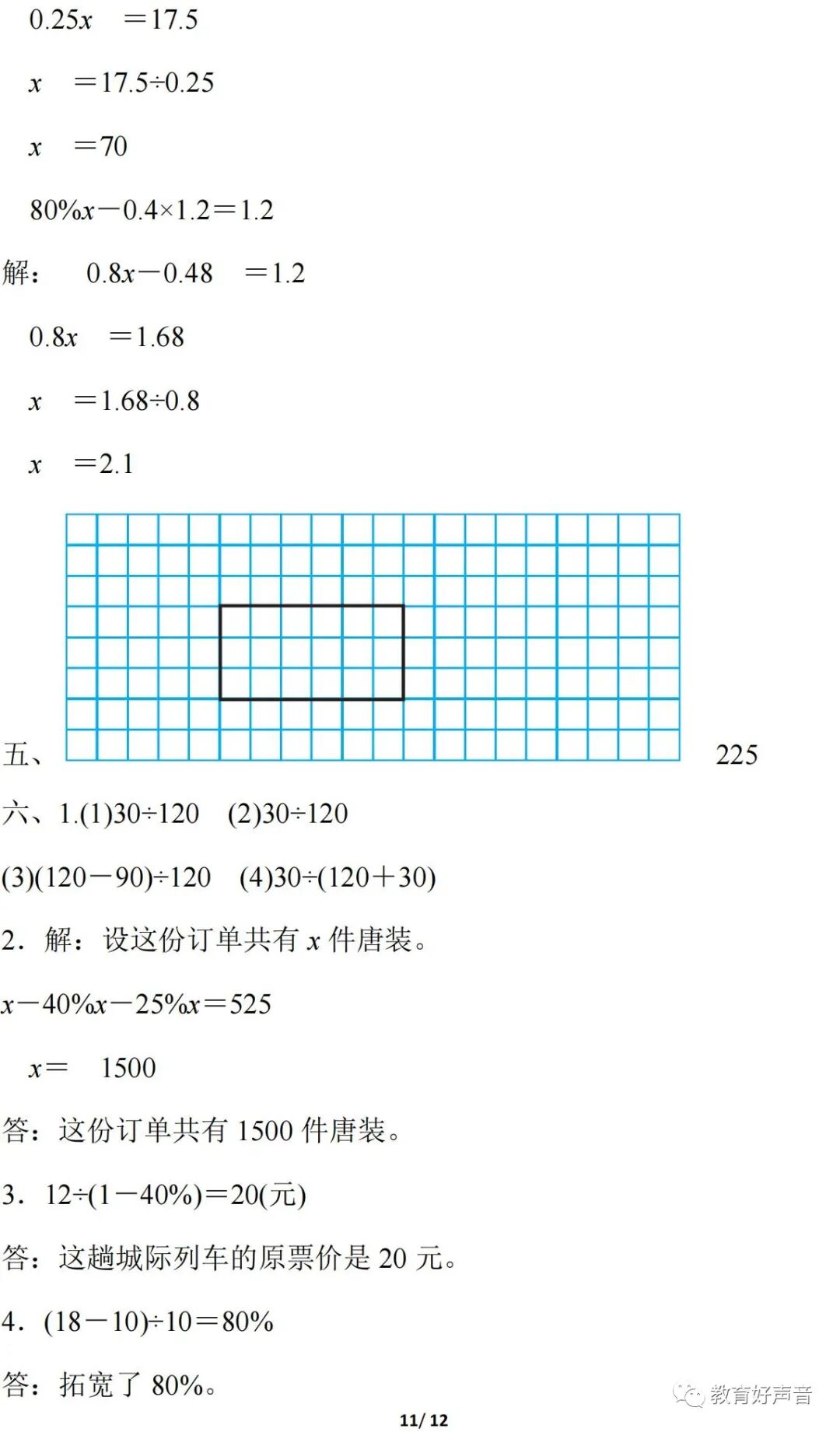 人教版数学六年级(上册)第六单元测试题,可打印!