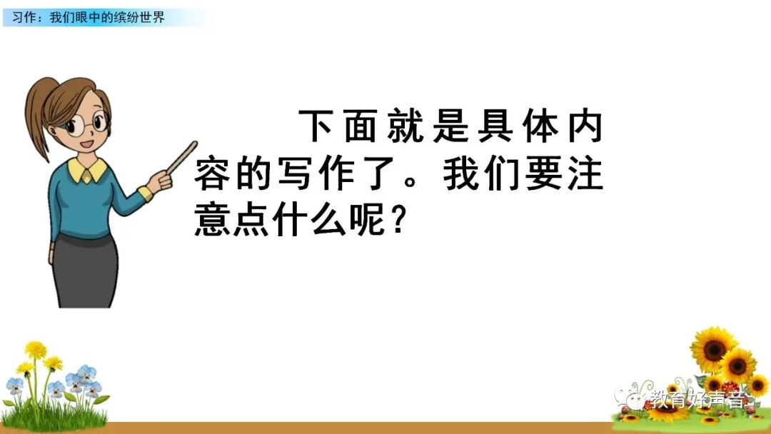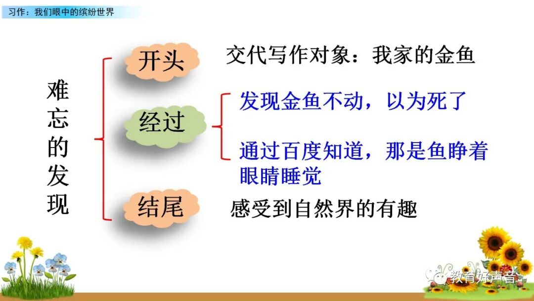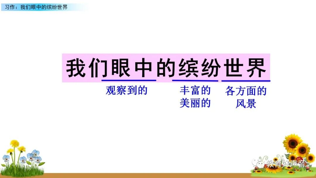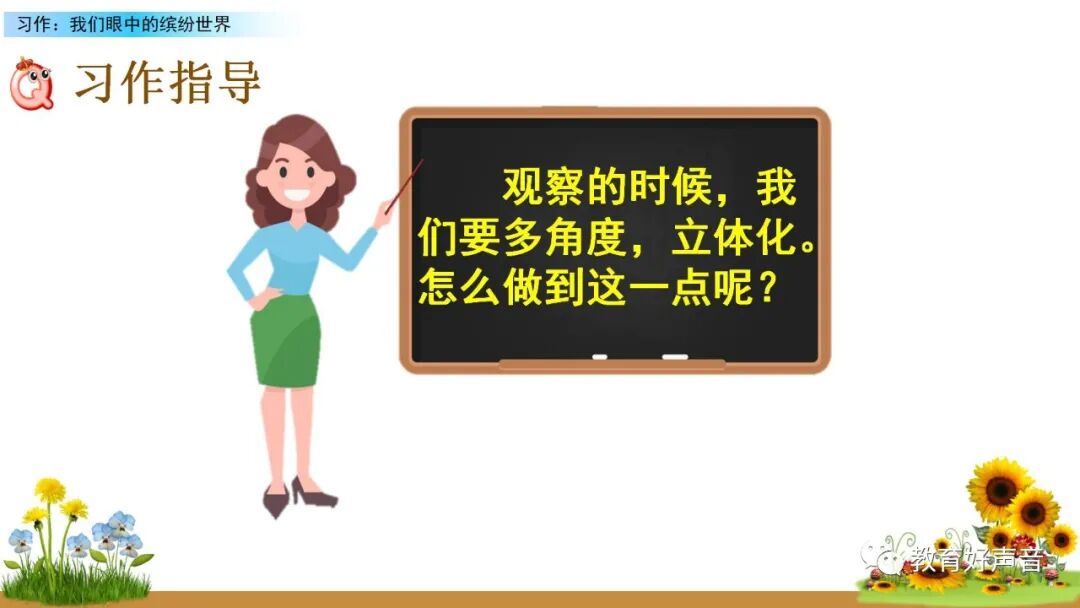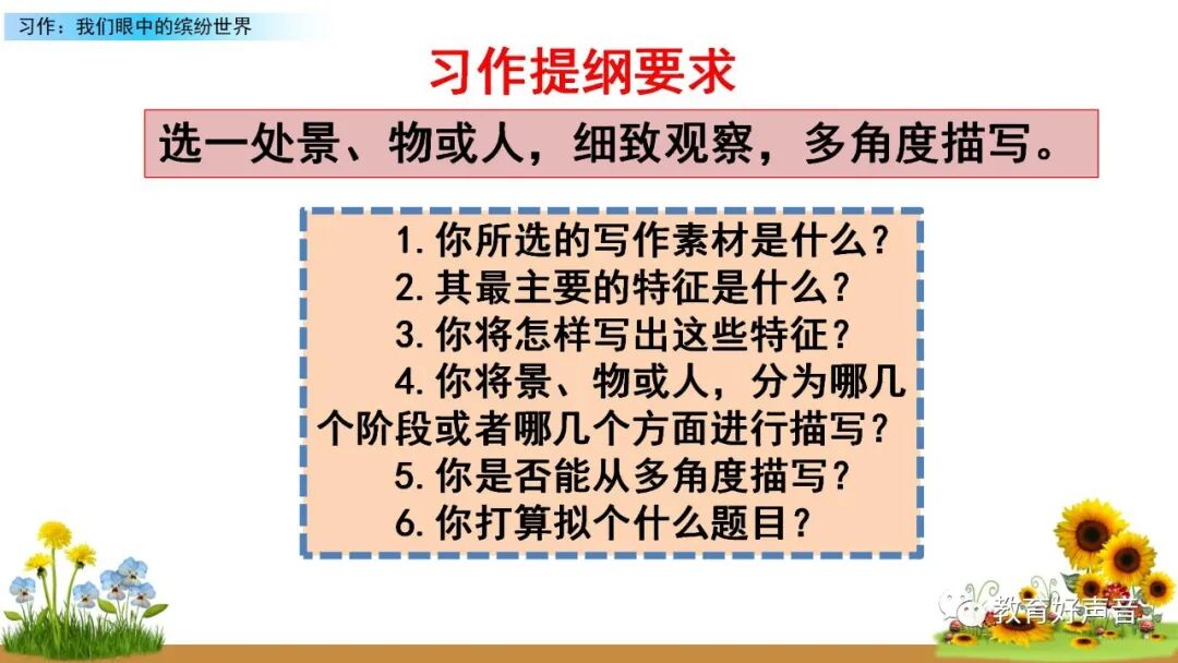 一、审题 本次习作要求我们留心观察周围的事物,选择观察时印象最深的一种事物或一处场景写下来。运用多种感官进行细致观察,突出事物或场景的典型特点。 二、选材与构思 生活中我们观察到的事物或场景有很多,如:上学路上的见闻、课间活动的场景、校园的美景……要想把眼中看到的缤纷世界描写出来,就要从中选择一个你印象最深的事物或场景来作为本次习作描写的对象,在习作的过程中要突出事物、人物、场景的典型特点。要想突出特点,选材时就要注意选择外形有特点、动作有特色、场景够独特的观察对象。如:写动物或人物,要注意观察外貌(外形)、动作、语言和神态,从而突出动物或人物的特点;写事物,要运用所学的观察方法进行观察,调动多种感官,写出事物的特点和变化;写场景,就要抓住场景的典型特点进行观察,注意把场景中的变化写具体,写清楚。