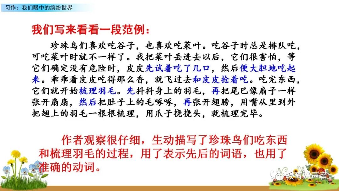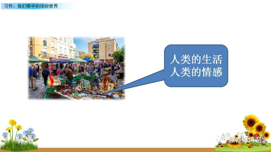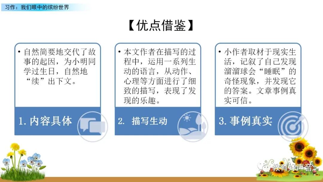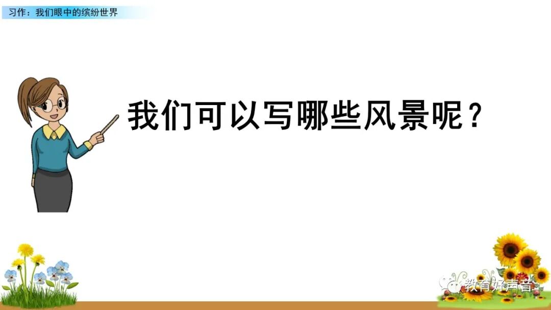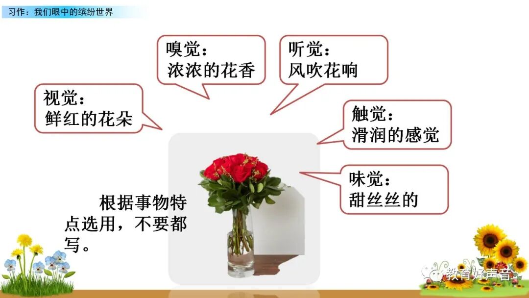 一、审题 本次习作要求我们留心观察周围的事物,选择观察时印象最深的一种事物或一处场景写下来。运用多种感官进行细致观察,突出事物或场景的典型特点。 二、选材与构思 生活中我们观察到的事物或场景有很多,如:上学路上的见闻、课间活动的场景、校园的美景……要想把眼中看到的缤纷世界描写出来,就要从中选择一个你印象最深的事物或场景来作为本次习作描写的对象,在习作的过程中要突出事物、人物、场景的典型特点。要想突出特点,选材时就要注意选择外形有特点、动作有特色、场景够独特的观察对象。如:写动物或人物,要注意观察外貌(外形)、动作、语言和神态,从而突出动物或人物的特点;写事物,要运用所学的观察方法进行观察,调动多种感官,写出事物的特点和变化;写场景,就要抓住场景的典型特点进行观察,注意把场景中的变化写具体,写清楚。