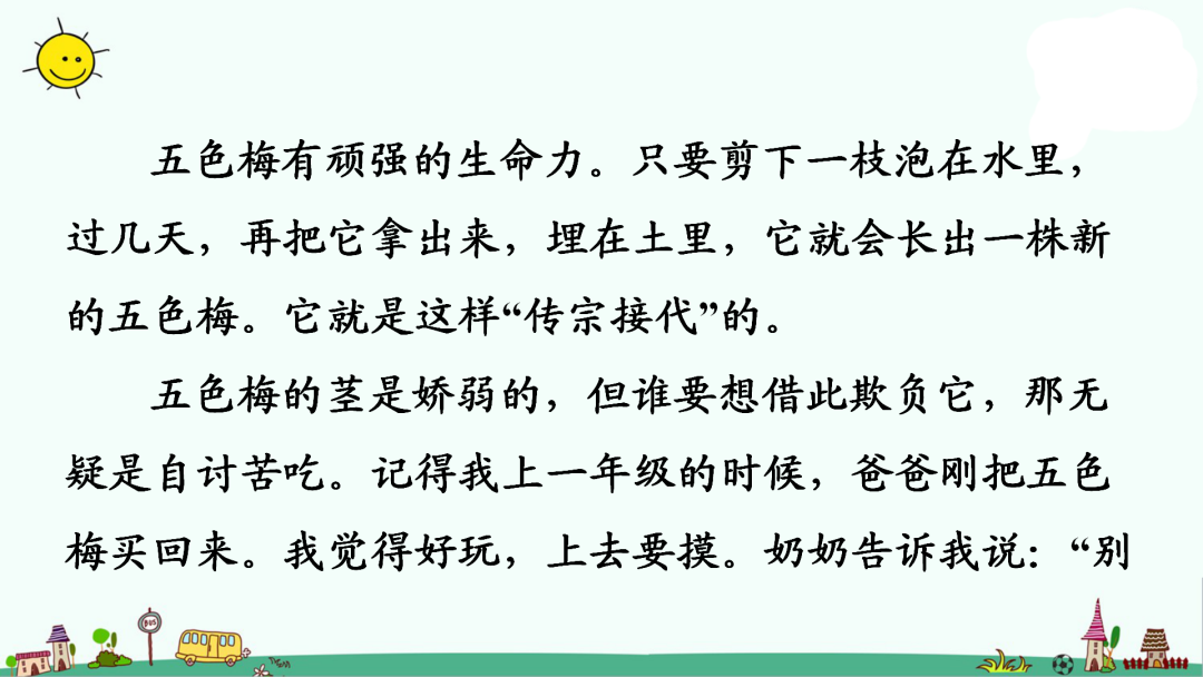 三、写作思路 1.审阅题目:本次习作的范围是“我们眼中的缤纷世界”,缤纷的世界可以是写一种事物,也可以写一处景物。 2.选定内容:(1)描写一种植物——仙人球。(2)抓住仙人球颜色和形状进行描写。(3)描写仙人球的生活习性。 3.表达方式:描写、抒情。 4.表现手法:对比手法,首尾呼应,借物喻人。 5.结构顺序:先直接点题,告诉读者我最喜欢的是仙人掌,并用对比的手法突出仙人掌的特点——坚强;接着写仙人掌的样子;然后写仙人掌的生活习性,再借物喻人,赞美解放军叔叔;最后在结尾赞美仙人掌与开头相呼应。 范文精选
