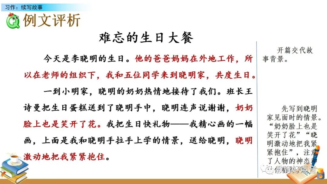 三、习作技法 1.仔细观察,确定内容。 这次的习作中有四幅图,其中最后一幅图以问号的形式出现,要在认真观察的基础上展开丰富的想象,大胆预测,把第四幅图补充完整后,才能让事情的经过有一个完整性。 2.展开想象,大胆预测。 要想把事情写清楚,就得先仔细观察,看看图上都有哪些人,他们在干什么,接着要展开想象,预测同学们是怎样给李晓明过生日的。 3.抓住人物,具体描写。 在弄明白图意之后,就要抓住人物的语言、动作、神态以及心理活动等进行细致的描写。 4.反复修改,交流感受。 草稿写完后一边读一边用修改符号把明显错误的地方改正过来,再和同学们交流,说说你更喜欢谁写的故事。 如何根据插图和提示续写故事呢? 插图和提示性文字可以帮助我们预测事情的经过及结果,让我们把一个不完整的故事写完整。 1. 整体观察,了解图文内容,推想人物关系及故事的基本情节。 2. 关注细节,推想人物心理。 3. 结合生活经验预测故事的多种结局,把故事补充完整。 4. 按事情发展的顺序把故事写具体。 习作例文