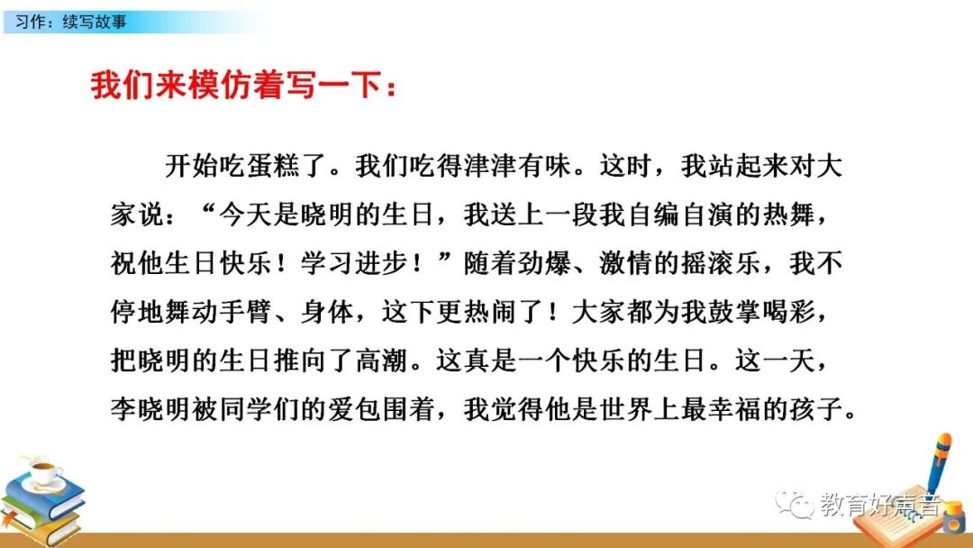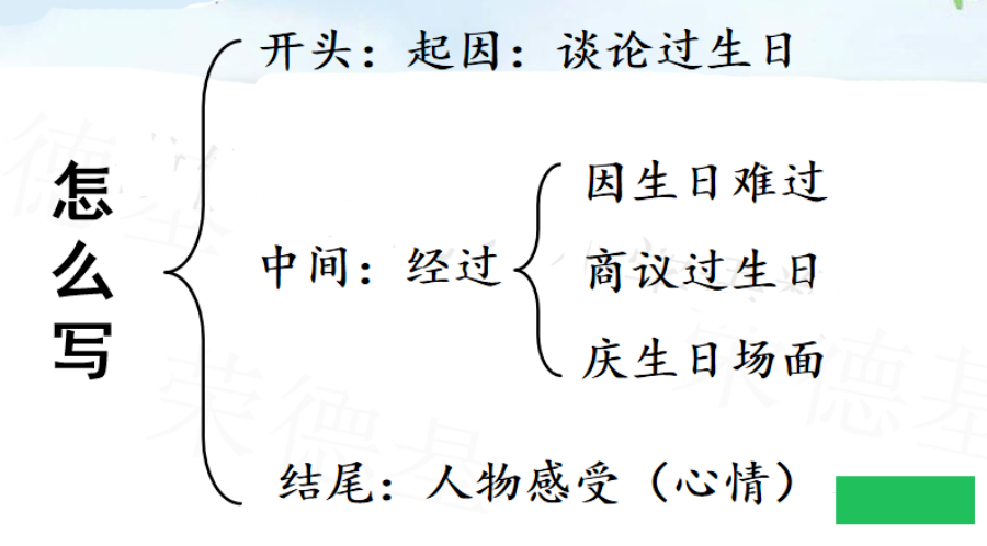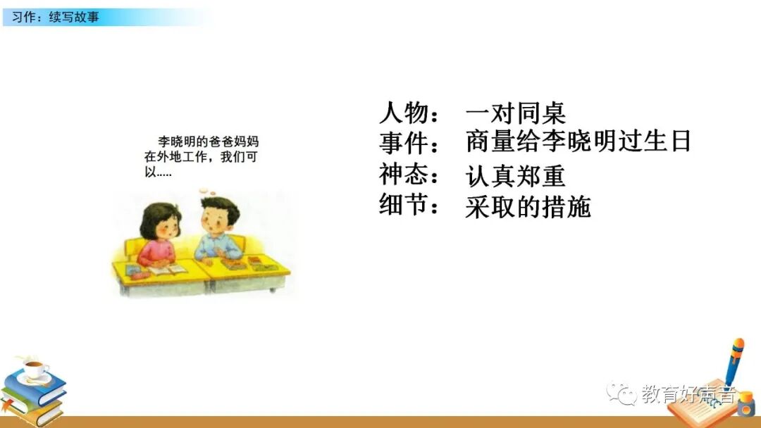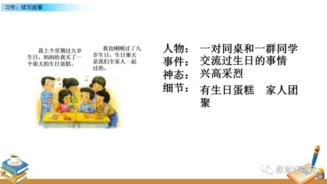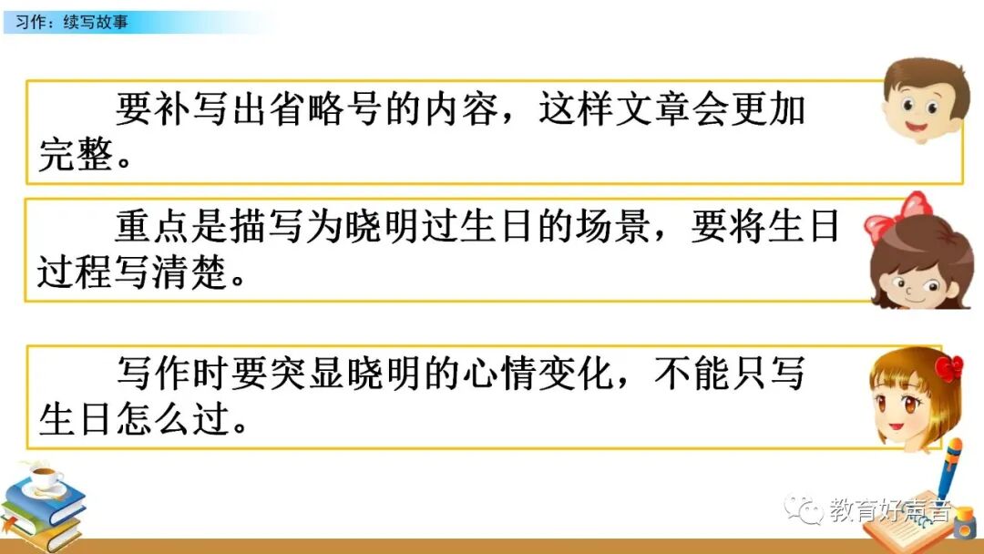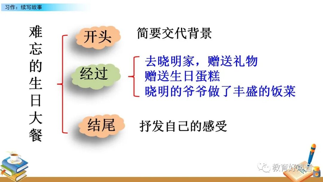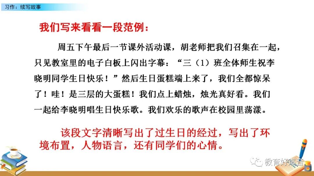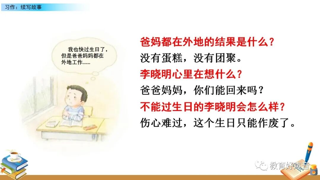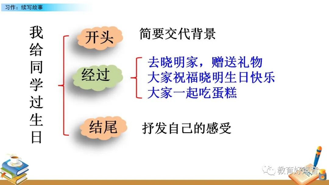 要想把图意表达清楚、内容叙述完整,就要在仔细观察的基础上进行预测,按事情发展的顺序把给李晓明过生日的过程写清楚,在预测的过程中要抓住人物的语言、动作、 神态、心理活动等来把事情写具体。写的时候要定好顺序,先写什么,再写什么,最后写什么。这样写起文章来才能做到了然于胸、文思泉涌。