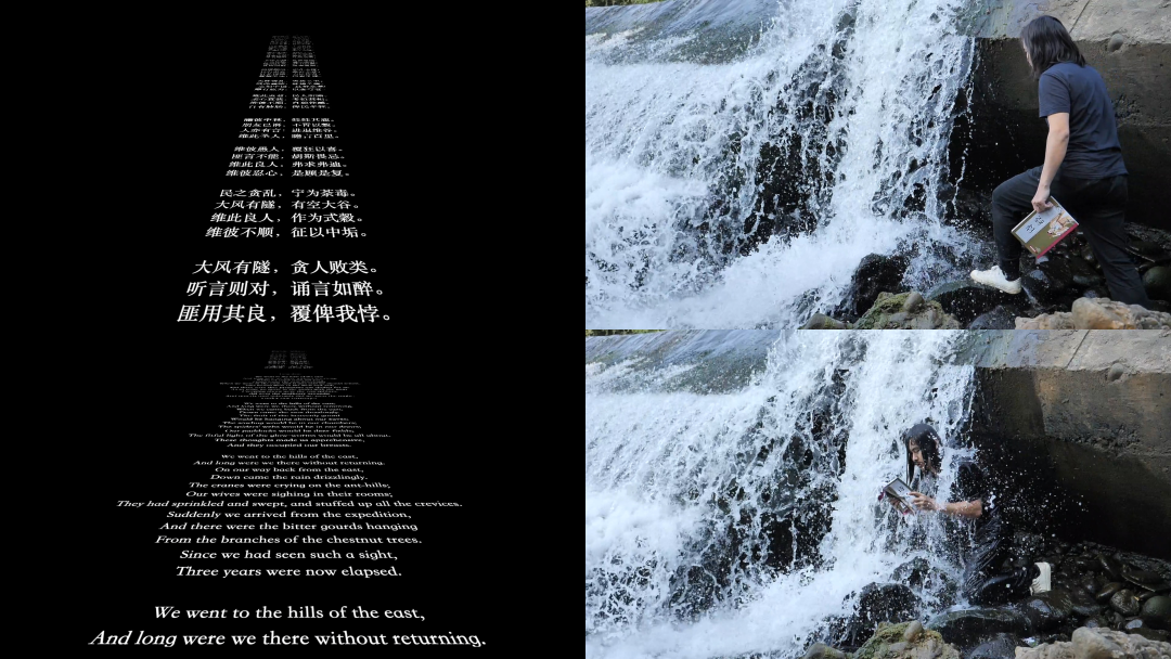 同样以带有强烈非现实意味的文学性叙事为出发点,邱岸雄多年来直面宏大的传统神话主题,以「新山海经」的名义及册页的古老形式重新构建了一个荒诞又真实的神话世界。厉槟源则以另一部古代经典「诗经」为母题,通过身体力行的方式见证了诗歌传统的消融与弥散。邱岸雄