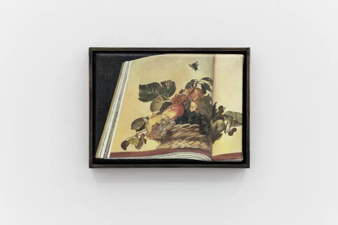 《苍蝇》(2013)与《两只小苍蝇》(2018)这两幅画描绘的是两本不同画册上相同的静物、画册与苍蝇这几个不同的“现实”层面。两幅作品描绘的对象在大小比例上有意进行了错位安排,以此强调了绘画和图像的固有欺骗性。本质上,图像只是一种试图超越幻象,使人认为具有“真实性”,但容易被虚构的东西。