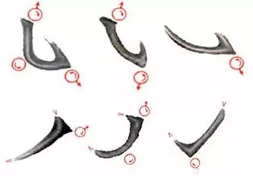 9、右弯钩、戈钩、心钩。竖笔写至弧转处,逆时针顺势捻管,笔锋始终铺毫行笔在笔画中线,至折钩处笔管向胸前欹斜,逆时针捻管随捻随提,调锋向左上行笔,笔尖收至弯钩的端部(左图)。
