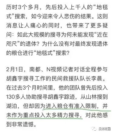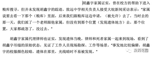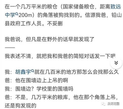 就连普通网友都会质疑怎么尸体之前没找到,警察、家属、搜救队、粮库工作人员更应该知道自己到底找没找过这里,更可能产生怀疑。而以现在的法医水平,对于死因,死亡时间,死亡后有无移动,生前还是生后套的脖子,很容易判断,无法糊弄。这不,发布会上公布了尸检情况,把器官缺失、中毒、骨折等都排除了,确认了活着的时候套上鞋带套:胡某宇尸体高度腐败,大部分皮肤皮革样化,头皮未见出血;全身骨骼完整,颅骨、脊椎及胸肋骨均未见骨折,部分牙齿因牙龈腐败脱落于现场,牙槽骨未见破损;胸腔、腹腔未见出血,各脏器在位无缺失,但均腐败,睾丸未见损伤;经毒物检验,胃组织和肝组织中均未检出常见的农药、鼠药、安眠镇静类成分。缢索为活套,绕颈形成闭环,颈部残存皮肤皮革样化,可见条形索沟一条,索沟边缘软组织见出血,出血部位与死者缢吊体位相吻合,符合生前缢索压迫形成。因为把尸体扛入粮库无理由也无可操作性,又有许多人猜测会不会有个罪犯集团早在14日就把胡鑫宇绑架进了粮库,在那里杀害了他,伪造自杀。学校和粮库外面是几十万平方米的野山金鸡山,他们若都成功把胡鑫宇弄出封闭校园的高墙了,在野外可以用各种方式杀害、掩埋,何必费那么大劲又把他弄进另一座高墙内?在围起来的有保安24小时值守的单位大院内实施谋杀,有什么好处吗?而且也没有可操作性。校园的墙和粮库的墙都很高,一个不畏惧死亡的年轻人可以一个人大胆攀爬,但罪犯们若要控制个会反抗、挣扎、呼救、有求生欲的年轻人,带着他翻两次墙,就太不现实了。不仅校园内黄昏时分人来人往,而且粮库大院内也生活着十几个人,闹出很大的动静怎么会不被发现。再问一句,这么做的目的又是什么?只有一种可能,才会不弄出大的动静:那就是胡鑫宇一个人自愿悄悄潜入大院,尽量不出声地坐在那里等待自杀。、