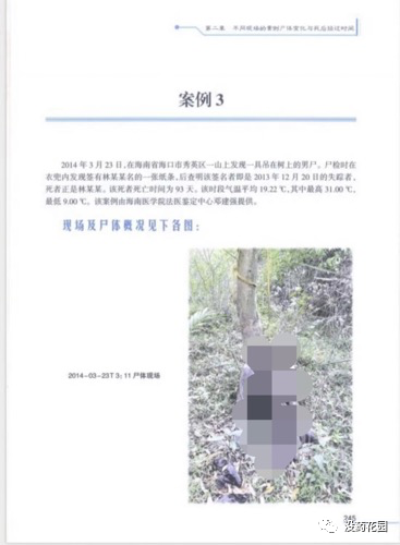 这个相似事件说明几点,一,听上去很尽职全面的搜索,也常常是有盲区的;二,自缢男子挂在鞋带上半个月,头身不会分离。还有个例子就是最近网上都在传的《尸体变化图鉴》中一个案例。2013年12月,海南一个林姓男子在树上挂脖上吊身亡,直到93天后才被人发现。这时长和胡鑫宇的时长也差不多了。值得注意的是,当地气温十分高,平均19度,最高31度,理应腐烂程度更高。而从该案例图片中看,他的脖子依然可以挂在绳子上。