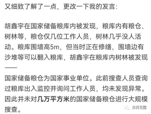 现在我们知道,胡鑫宇的遗体是在粮库内发现的。综合多家媒体的报道,这个粮库位于金鸡山上,是国家事业单位大院,距离学校200多米左右,由5米高墙围着,总共占地约92亩(6万多平方米),平时有十几人(3、4户人家)住在里面。在粮库废弃区域靠墙的角落里有一片杂树林(大概箭头指的地方),面积是9300平方米。据央视采访,因为有过去养蛇场跑掉的蛇出没,工作人员平时从不走到那里去活动,那里林子很密,也没有可下脚的路。据澎湃新闻报道,“粮库保安到竹林处砍竹子,同时也去找一只走丢的鸡,带了一只狗走去那里。狗过去之后好像发现了什么东西,不停地叫。保安进竹林一看,才发现里面靠近围墙位置竟然有一具人的遗体。”现在不同媒体已经分别采访过学校、家属、搜救队队长,得到的答案是一致的:当时确实漏掉了那个位置。粮库属于国家事业单位大院,进去搜查需要审批。经致远中学校长协调,向粮库取得的通行证后,一名老师陪同家属进去找过一次,但没有走到发现遗体的位置。而搜救队队长表示,当时因为进入有限制,没有对粮库投入太多精力搜寻。而根据新闻发布会,“该粮库内部主要区域装有视频监控,门口有门卫24小时值守并养有护院犬,未经许可禁止进入,我们先后于2022年10月20日、21日,11月26日、27日开展四次搜寻,对粮库进行了走访,并对全部建筑物内部开展了搜寻,也对粮库旁的玻璃厂废弃厂房进行了搜寻,但胡某宇尸体缢吊地点位于院内约9300平方米树林区域内,未搜寻到位。2022年11月27日下午搜寻时,走访民警在完成该单位内东北侧废弃宿舍搜寻工作后,前往事发现场附近的树林洼地时,该区域植被茂密,未发现异常情况,就没有继续深入搜寻,而是要求该单位继续开展自查工作,发现异常情况要及时报告。以上情况,说明我们工作还存在不足,我们将举一反三,进一步改进工作。”