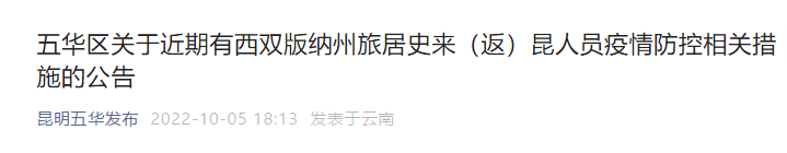 10月5日,昆明市五华区发布关于近期有西双版纳州旅居史来(返)昆人员疫情防控相关措施的公告。详情如下↓