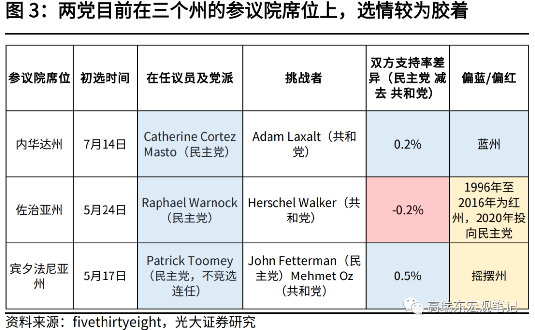 民主党选情承压,不仅受到美国国内通胀高企物价飞涨,美国政治极化、社会动荡不安,伊拉克仓促撤军等因素拖累,共和党积极筹划选区重划、共和党铁票仓新增2席位、特朗普积极为共和党候选人背书,也起到了重要的影响。(详情可参考我们在2022年6月26日外发的报告《中期选举:红色浪潮能否席卷美国?》)。