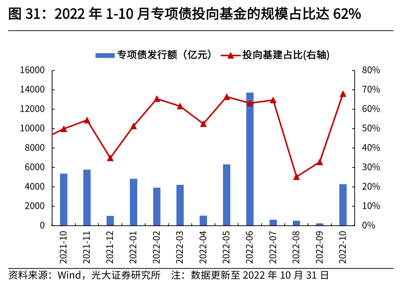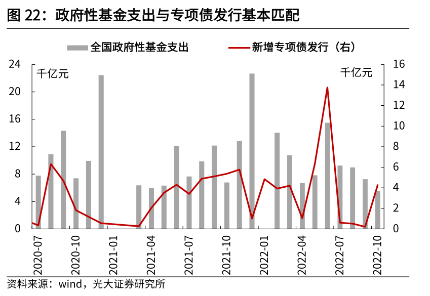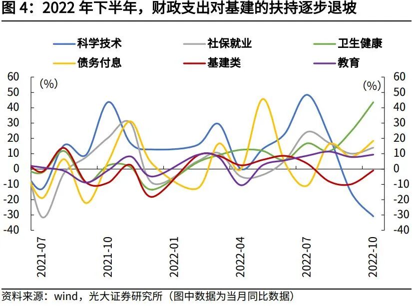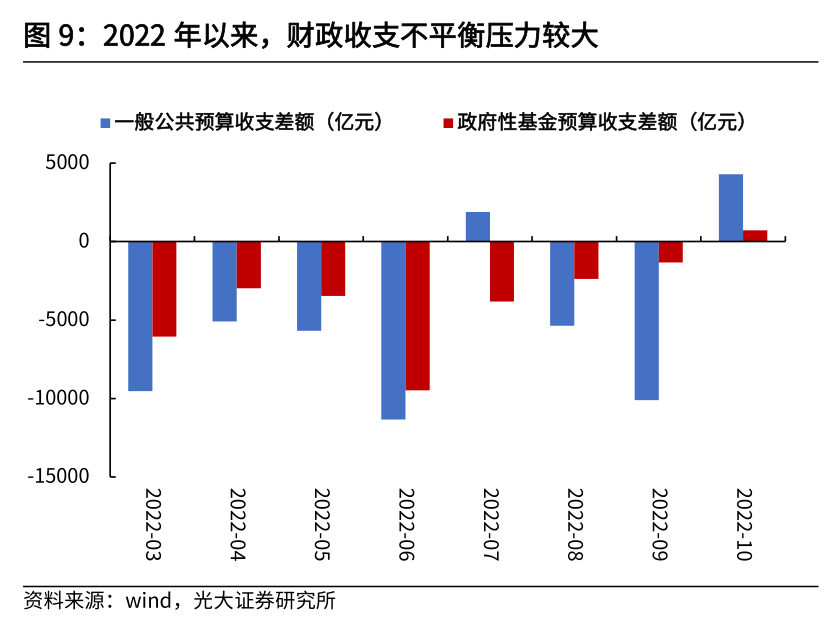 从2022年收入分类来看,财政政策持续向企业端发力,大规模减税降费使得增值税、企业所得税持续对财政收入形成拖累,个人所得税则恢复较快。1-10月,增值税累计同比增速为-29.1%,主要受到了留抵退税的影响;企业所得税累计同比增速为3.5%,8-9月当月同比增速均为负,主要受到减税降费与缓缴税收的影响;个人所得税累计同比增速为8.5%,上半年疫情冲击过后,个税增速已开始逐步修复。因此,从1-10月财政收入端来看,积极财政主要向企业端倾斜。从2022年支出分类来看,上半年基建类支出持续高增,下半年逐步退坡,向社保就业、卫生健康、债务付息等相对刚性支出倾斜。上半年,基建类支出(包含节能环保、城乡事务、农林水务与交通运输)累计支出增速为7.4%,下半年逐步退坡,8-10月基建类支出当月同比增速均为负;社保就业方面,1-10月累计支出增速为7.4%,其中7-10月支出当月同比增速均维持在10%以上的高增速区间;卫生健康方面,今年疫情持续扰动下,各地疫情防控压力加大,卫生健康支出持续处于较高增速;债务付息方面,1-10月累计支出增速为8.5%,年内地方政府债务付息压力较大。1.4 广义财政:准财政逐步发力,托起下半年基建