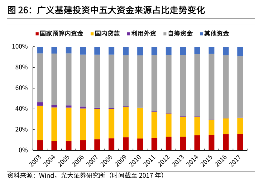 基础设施建设的资金来源主要可以分为财政资金和社会资金。根据统计局披露,基建投资来源主要分为国家预算资金、国内贷款、利用外资、自筹资金和其他资金五大项。其中,国家预算内资金属于财政资金,包括一般预算、政府性基金预算等。国内贷款、外资、自筹资金、其他资金等属于社会资金。2018年以前,统计局会公布基建投资的资金来源分类。通过观察2003至2017年广义基建中各类资金来源的占比走势,我们发现,近年来国家预算内财政资金占比逐步上升,而受到地方隐性债务强监管的持续影响,国内贷款融资来源占比有所走低。从基建的四大分项来看,交通运输邮政业与水利环境和公共设施管理业对于财政资金的依赖度较高,而公共事业与信息传输业基建对于财政资金的依赖度较低,主要通过市场化融资完成。主要原因在于,交通运输邮政业建设周期较长、普遍回款速度较慢,对财政资金依赖度较高;而公共事业类与信息传输类基建普遍建设周期短,且使用者付费频率较高,回款周期快,因此对财政资金的依赖度低。![]()