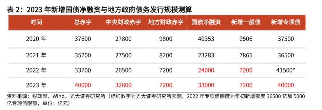 受债务率警戒线的掣肘,2023年地方政府加杠杆空间较为有限。国际上通行的债务指标有两个,一个是从全国汇总来看,即政府债务余额占GDP的比重,衡量总的政府债务水平;另一个是衡量地方政府债务风险水平的指标,就是地方政府债务率。地方政府债务率是债务余额除以综合财力,债务余额包含一般债余额、专项债余额与城投债余额,综合财力包括一般公共预算和政府性基金预算的本级收入、中央转移支付等。2020年以来,地方政府债务快速积累,债务付息压力不断加大。2017年至2019年,地方政府债务率一般稳定在90%以下,2020年债务余额快速上升,地方政府债务率升至93.6%,2021年,新增专项债继续维持高位,地方政府债务率达116%。国际上通行的标准在100%到120%之间,2022年在3.65万亿新增专项债基础上,还追加使用了5000多亿结存限额,这将推动2022年地方政府债务率或突破120%的债务警戒线,地方政府加杠杆空间有限。与近些年政府债务规模攀升相对应的是,地方政府偿债本金、利息规模也在不断扩大,偿债压力加大。财政部数据显示,近些年地方政府债券到期偿还本金和利息快速增长,2021年偿还本金约26685亿元,偿还利息9280亿元。由于地方偿债本金可以依靠发行再融资债券来借新还旧,极大缓解了地方政府偿债压力。2021年地方发行2.3万亿元再融资债券来偿还本金。但利息必须要用真金白银的财政收入来偿还,不能借新还旧。近年偿债利息规模不断增加,占地方财政收入比重逐步提高,地方政府的偿债压力不断加大。因此,在地方债务扩张约束下,2023年地方加杠杆空间有限,主要靠中央来加杠杆。但考虑到2023年仍有较强的稳增长诉求,重大项目的继续建设需要财政资金的可持续投入,不排除发行特别国债的方式,以弥补地方财政的资金缺口,我们预计特别国债的规模可能在1万亿左右。国债层面,国债净融资一般与中央财政赤字相匹配,2023年中央财政赤字空间或打开,因而我们预计国债净融资额或比2022年多增9000亿左右,达3.3万亿。一般债层面,新增一般债一般与地方财政赤字相匹配,在当前地方政府债务压力下,扩张空间有限,我们预计与2022年持平,为7200亿。专项债层面,考虑到地方政府债务压力,我们预计2023年新增专项债额度或为40000亿,较2022年低约1500亿(2022年新增专项债36500亿+5000亿专项债限额)。但由于2023年仍有较强的稳增长诉求,重大项目的继续建设需要财政资金的可持续投入,因此不排除发行特别国债予以支持。我们预计2023年发行特别国债的紧迫性上升,规模在1万亿左右。特别国债是由中央财政统一发行的特殊国债,不计入财政赤字,纳入国债余额限额,全部转给地方主要用于基础设施建设和其他相关支出,并带有一定财力补助的性质。由于特别国债不计入财政赤字,也不计入地方债务余额,因而并不构成地方政府的债务压力,是地方债务率较高而稳增长需求又较为迫切时的合适选择。2020年3月,为应对疫情冲击导致的经济下行压力,中共中央政治局召开会议指出,要加大宏观政策调节和实施力度,适当提高财政赤字率,发行特别国债,增加地方政府专项债券规模,引导贷款市场利率下行,保持流动性合理充裕。2022年5月,政府工作报告指出,中央财政发行抗疫特别国债1万亿元,不计入财政赤字。2.5 狭义财政收支:收支矛盾仍然突出,读数有所分化