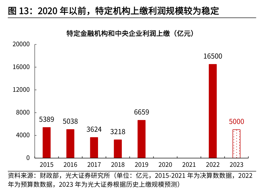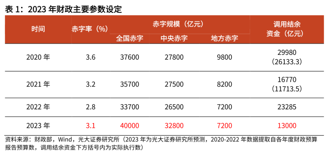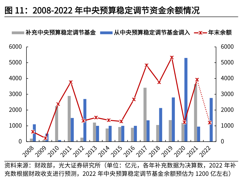 2022年,在财政预算草案中,对财政基调的表述是“积极的财政政策要提升效能,更加注重精准、可持续”。展望2023年,在跨周期调节背景下,宏观政策更注重连续性、稳定性、可持续性。因而在经济下行压力过大的时候,积极财政的总基调难言转向,预计2023年财政政策将持续积极。但由于地方政府面临较大债务压力,财政也需要兼顾“防风险”和“稳增长”的平衡,预计地方政府继续加杠杆空间有限,而中央财政赤字空间或进一步打开。一则,2023年财政收支矛盾仍较为突出,财政积极发力需要增量资金扶持。收入端看,新的经济下行压力对财政收入增长形成制约,疫情以及国际形势变化也会加大财政收入不确定性;支出端看,稳增长对财政资金需求仍然较大,重大项目的开工建设需要财政的持续投入,做好“六稳、六保”也需要财政进一步扶持。二则,2023年财政增量工具更为紧缺,可用结余资金相比往年略显不足。第一,2022年启用的一次性增量工具在2023年难以持续;第二,2022年无论狭义财政或广义财政,财政收支差额预计均为负,收支存在较大缺口;第三,2022年消耗了过多的存量调节资金,2023年可用结转结余资金相比往年略显不足。三则,过去两年财政强调可持续,中央政府杠杆率并未大幅上行,2023年加杠杆有空间。2021年,财政收缩推动杠杆率快速下行;2022年,虽然经济下行压力较大,但积极财政发力更多依赖广义财政,宏观杠杆率并未大幅上行;因而2023年,在财政增量工具更为紧缺而政府杠杆率并不高的背景下,政府存在一定的加杠杆空间。我们预计,2023年赤字率或按照3.1%安排,比2022年上行0.3个百分点,接近2021年水平,赤字规模或达4万亿以上。分地方和中央来看,我们预计中央是加杠杆主力,2023年中央财政赤字规模达3.3万亿,比2022年上行6300亿;2023年地方财政赤字规模7200亿,与2022年基本持平。结转结余资金是财政收支的重要补充,也是财政跨年度预算平衡的主要工具。其中,中央预算稳定调节基金和地方财政结转结余资金(及调入资金)是一般公共财政的缓冲垫,通过调入调出,可以实现年末财政赤字契合年初目标。预算稳定调节基金建立于2007年,2018年《财政部关于印发〈预算稳定调节基金管理暂行办法〉的通知》(财预35号)对预算稳定调节基金规定进一步细化。预算稳定调节基金通常在年初调入一般公共预算收入,年末再将结余以及超支部分补充预算稳定调节基金。根据历年财政部数据,2008-2021年的14年间,中央预算稳定调节基金累计补充2.02万亿,累计调入一般公共预算2.24万亿。截至2021年末,中央预算稳定调节基金余额3926.22亿元。2022年初一般公共预算从中央预算稳定调节基金调入2765亿,2022年初中央预算稳定调节基金余额为1161.22亿元。从2022年中央财政收支来看,超支歉收特征较为明显,财政缺口较大,用于补充中央预算稳定调节基金的财政超收和结余部分明显不足,我们预计2022年末中央预算稳定调节基金余额大约在1200亿左右。如果没有其他资金调入补充,那么可用于调入2023年的预算稳定调节基金结转结余部分将非常有限。与中央借助预算稳定调节基金实现跨年度平衡一致,地方财政也会借助跨年度预算平衡机制、财政资金统筹使用和盘活存量资金等,通过地方财政结转结余(及调入资金)的方式达成财政收支平衡目标。根据财政部的说明,地方财政结转结余当年不列预算支出,在以后年度实际使用时再列预算支出;国库集中支付结余按权责发生制当年列预算支出,下年实际支出时,再作冲抵。根据财政部公布的数据,2017年末地方财政除国库集中支付结余外的结转结余资金余额为9102亿元,此后不再公布余额,我们进行了估算。由于政府性基金预算收支差额是调入结转结余的主力,我们根据2018-2021年地方政府结转结余的调入以及使用测算,截至2021年底,地方政府结转结余余额约为1.45万亿。2022年初,调入1.3万亿到地方一般公共预算中,叠加2022年预估地方政府性基金收支结余的2700亿,我们预计2022年末地方政府结转结余余额4200亿左右。除中央预算稳定调节基金和地方财政结转结余资金,在财政压力相对较大的年份,财政部也会通过国有资本经营预算、盘活存量资产,增大可调入的结转结余资金。因此,虽然2023年中央预算稳定调节基金和地方财政结转结余资金的增量空间不足,但是国有资本经营预算、盘活存量资产仍有增量空间。国有资本经营方面,主要包含两部分,一部分是“特定金融机构和上缴利润”,计入一般公共预算的非税收入科目,在财政压力较大的年份,通过加大存量留存利润的上缴利润,从而增加可调配的盈余资金;另一部分是“国有资本经营预算”,使用单独的账本核算,超收部分一般也会调入一般公共预算补充缺口。对于“特定金融机构和上缴利润”,2015-2016年稳定在5000亿左右,2017-2018年略微下降,2019年收支压力较大时上调为6659亿。2020-2021年,对特定国有机构暂停上缴利润,主要原因是其他政策工具箱充足,暂停上缴也为之后预留政策空间;2022年该科目预算上调至1.65万亿,主要是2020-2021年结存利润的上缴。但该科目规模的上升是一次性的,在2022年使用完毕后,2023年的增量空间非常有限,我们预计该科目2023年恢复至正常规模5000亿。对于“国有资本经营预算”,这部分每年上缴规模比较稳定,增量空间取决于国有企业经营收入的增量与上缴比例的增量。从国有企业经营收
