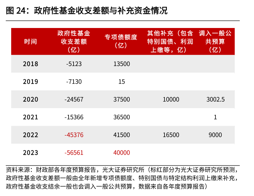 第一,国家预算内资金,主要包含一般公共预算和政府性基金预算。1)一般公共预算:预计2023年一般公共预算支出规模为28.09万亿元,同比增长6.2%,投向基建规模较2022年多增2050亿元。按照我们对财政收支的预测,我们预计2022年全国一般公共预算收入19.96万亿(年初预算数为21.01万亿),同比下降1.4%(年初预算数为3.8%),一般公共预算支出26.45万亿(年初预算数为26.71万亿),同比增长7.4%(年初预算数为8.4%);2023年,我们预计全国一般公共预算收入22.76万亿,同比增长14.0%,一般公共预算支出28.09万亿,同比增长6.2%。从一般公共预算对基建的投入来看,2021年广义基建中来自国家预算内资金为3.17万亿,占当年一般公共财政支出的13%左右,考虑到2022年狭义财政对卫生健康、社会保障以及债务付息的支持,2022年公共财政对基建的支持占比或回落至12.5%左右。考虑到2023年财政稳就业、保民生诉求不减,预计一般公共预算支出向基建倾斜力度有限,假定与2022年投向比例一致,则2023年一般公共预算投向基建规模较2022年增加2050亿元(264500*6.2%*12.5%)。![]()