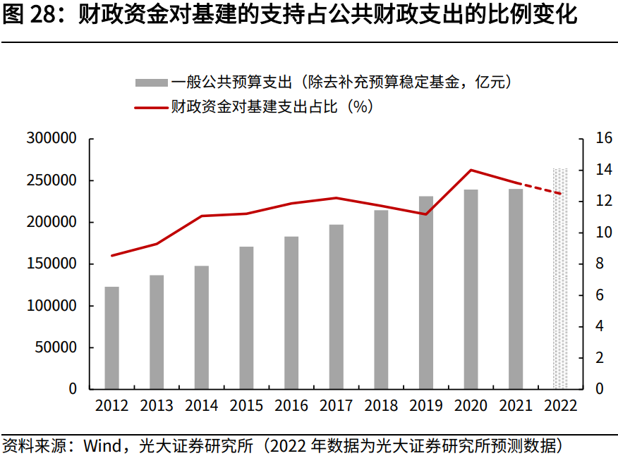 收支情况来看,2022年财政收支大概率以“超支歉收”结官,2022年收入进度整体偏慢,预计全年收入增速大概率为负,低于年初预算的3.8%;支出进度整体保持平稳,全年支出增速可能略低于年初预算的8.4%。上半年,狭义财政是基建发力的主角,预算内基建类支出增速持续加快。下半年,广义财政迎来高光时刻,接力狭义财政撑起基建高增长空间。无论是8000亿政策性银行信贷、6000亿政策性金融工具还是5000亿专项债限额,均指向广义财政的积极发力。在广义财政支撑下,全年基建增速或达10%以上。2023年,预计财政维持积极基调不变,中央打开赤字空间,地方债务压力掣肘加杠杆空间,发力或向需求侧与居民端集中,基建稳增长仍依赖准财政资金。第一,财政基调上,预计2023年将持续积极,中央赤字空间或打开。一则,2023年财政收支矛盾仍较为突出,财政积极发力需要增量资金扶持。二则,2023年财政增量工具更为紧缺,可用结余资金相比往年略显不足。三则,过去两年财政强调可持续,中央政府杠杆率并未大幅上行,2023年加杠杆有空间。我们预计,2023年赤字率或按照3.1%安排,赤字规模或达4万亿左右。第二,债务压力上,2023年地方政府受债务率警戒线的掣肘,加杠杆空间较为有限。2020年以来,地方政府债务快速积累,债务付息压力不断加大,2022年地方政府债务率或突破120%的债务警戒线。因此,在地方债务扩张约束下,2023年地方政府加杠杆空间有限,但考虑到2023年仍有较强稳增长诉求,我们预计2023年新增专项债规模在4万亿左右,并且发行特别国债的紧迫性在上升。第三,财政收支上,一般公共预算收入读数显著改善,政府性基金预算仍受到土地财政牵制。大规模留抵退税以及延缓缴税使得2022年基数较低,2023财政收入增速读数将大幅走高,但实际收入增速仍受到内需疲弱与外部环境的影响。2023年土地市场或边际修复,但修复存在上限,政府性基金收支难以大幅扩张。第四,发力方向上,财政政策或转向需求侧和居民端刺激。2022年大规模减税降费使得企业端受益较多,居民端受益较为有限,因此导致内需恢复疲弱。2023年,企业端大规模减税降费空间较为有限。着力扩大内需,促进需求侧持续复苏,将是2023年经济工作的重点,财政也将从这一领域着手,力促有效内需改善。第五,2023年稳增长仍需基建支撑,但预算内资金支持力度将有所减弱,基建扩张仍需准财政持续发力,预计全年基建增速7%~10%。一方面,在专项债难以继续大幅扩容背景下,我们预计2023年预算内资金对基建支持将减弱。另一方面,准财政举措余粮仍充足,政策性银行信贷、政策性金融工具等仍有加量空间,预计2023年政策性金融工具仍有增量空间,结合2022年政策性工具的持续杠杆作用,撬动的新增基建投资规模在2万亿左右。2022年,财政政策明显积极发力,“增支减收”和“加快节奏”成为重心,狭义财政与广义财政轮番接力,高强度支出支撑基建高增速。