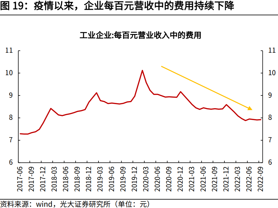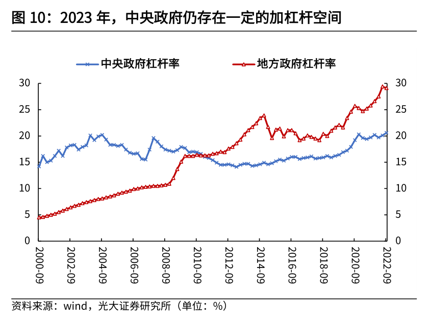 第二,财政工具方面,2023年财政增量工具更为紧缺,政府杠杆格局或进一步打开。2022年财政的积极发力得益于往年丰富的财政结余资金与各种增量工具的接连启用。一方面,过去几年的“超收歉支”为2022年财政发力创造了丰富的结余资金;另一方面,2022年二季度以来,为对冲疫情导致的经济下行压力,财政的增量工具空间被依次打开,包括政策性银行信贷额度、政策性金融工具,以及专项债限额,成为下半年财政发力的重要支撑。展望2023年,财政增量工具或更为紧缺。一方面,2022年财政收支不平衡压力持续加大,因此预计2022年财政结余相比往年大幅减少,这导致相比2022年,预计2023年可调入的结余资金将明显不足。另一方面,2022年启用的很多增量工具是一次性的,并不可持续,包括1.1万亿的央行上缴结存利润、5000亿专项债限额等。因此,2023年财政的积极发力更倚赖政府加杠杆空间的打开。回顾2020年以来的政府杠杆率变化,2020年财政整体加杠杆,目标赤字率上调、发行抗疫特别国债,使得2020年末我国宏观杠杆率上行至270.1%;2021年,国内经济处于“稳增长压力较小的窗口期”,财政收缩背景下,推动宏观杠杆率快速下行至263.8%;2022年,虽然经济下行压力较大,但积极财政的发力更多依赖结余资金与准财政工具,中央政府杠杆率并未大幅上行。因此2023年,在财政增量工具更为紧缺而中央政府杠杆率并不高的背景下,政府存在一定的加杠杆空间。第三,发力领域方面,2023年企业端继续大规模减税降费的空间较为有限。2022年财政发力的重点在供给侧与企业端,通过实施大规模的存量留抵退税政策,持续为市场主体减负,带动企业部门成本费用持续下降,营业收入稳步回升。根据税务总局数据,截至11月10日,已退到纳税人账户的增值税留抵退税款达23097亿元,新增减税降费7896亿元;累计办理缓税缓费6797亿元。这些举措增强了企业发展动能,1月1日-11月10日,全国企业采购设备投资同比增长4.9%,其中装备制造业采购设备投资同比增长9.8%。但2022年财政对供给侧以及企业端的有效刺激对需求侧的传导并不畅通,大规模的减税降费举措直接获益的多是企业部门,如留抵退税大多用于补偿企业经营现金流,减征车辆购置税提升购车需求使得汽车企业经营改善较多。总而言之,2022年财政政策对居民端和需求侧的拉动较为有限。展望2023年,在存量留抵退税实行完毕后,2023年企业端的减税降费空间较为有限,财政转向需求侧和居民端刺激的必要性和紧迫性上升。2.2 2023年财政基调:持续积极,中央赤字空间或打开
