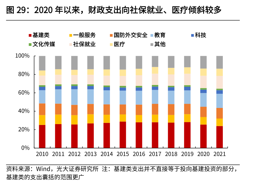 收支情况来看,2022年财政收支大概率以“超支歉收”结官,预计2022年全年收入增速大概率为负,低于年初预算的3.8%;支出进度整体保持平稳,全年支出增速可能略低于年初预算的8.4%;收入分类来看,非税收入持续高增,大规模减税降费使得增值税、企业所得税持续对财政收入形成拖累;支出分类来看,上半年基建类财政资金支出增长较快,下半年逐步退坡,向社保、卫生健康倾斜。下半年,广义财政迎来高光时刻,接力狭义财政撑起基建高增长空间。无论是8000亿政策性银行信贷、6000亿政策性金融工具还是5000亿专项债限额,均指向广义财政积极发力。在广义财政支撑下,2022年下半年基建增速维持高位。我们预计,全年基建增速达10%以上。1.1 发力节奏:靠前、更大力度、强调可持续