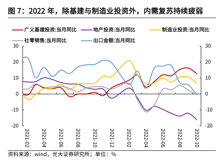 一则,2022年下半年以来,需求恢复持续疲弱成为经济面临的主要挑战。从“三驾马车”的角度看,除基建投资需求持续高增外,受疫情扰动,消费需求的复苏持续疲弱;投资需求中,地产投资持续为负,制造业投资虽有一定韧性,但是民间投资资本开支仍显疲弱,企业信贷扩张动力不足。