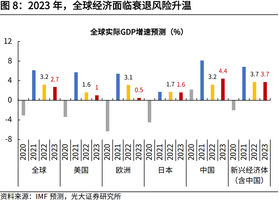 二则,2023年全球经济面临衰退风险升温,国际环境形势在某种程度上比2022年初更复杂,全球总需求下降或持续拖累国内出口。根据10月份IMF对全球经济的预测,预计2023年全球GDP同比增长2.7%,相比2022年的3.2%下滑0.5个百分点,其中美国、欧洲2023年的GDP分别较2022年下滑0.6、2.6个百分点。在此背景下,今年年底到明年,中国的出口将会明显承压。因此,如何实现增长动力的转换,着力扩大内需,这可能是2023年经济工作的重点。![]()