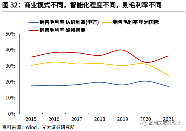 酷特智能是国内最早尝试在纺服行业推动C2M模式(用户直连制造)创新的企业之一。以单件定制为核心模式,酷特智能一方面利用互联网高效收集客户个性化量体参数,另一方面积极引进智能制造软硬件,并在此基础上搭建自有生产流水线,积累了丰富的应用经验和数据资源。基于智能制造的定制化业务模式,也确实带来了相比纯代工模式更高的毛利率。