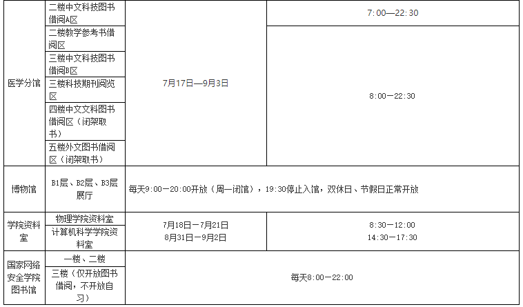 7月17日至9月3日期间,图书馆开放时间为7:00—22:30。网上电子资源服务每天24小时开放。