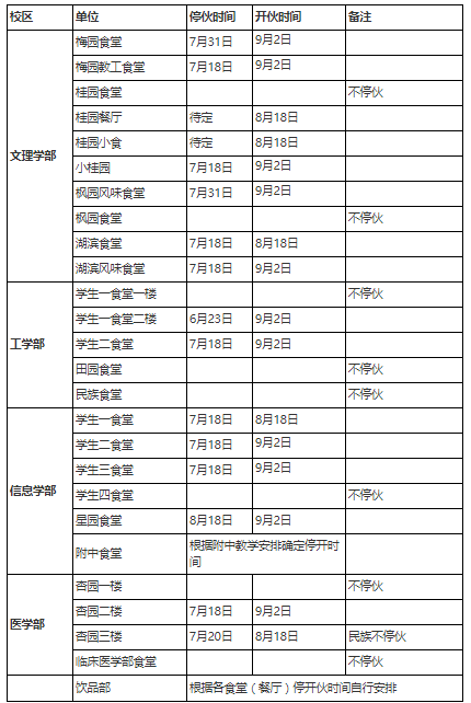 暑假期间各校区食堂、餐厅开伙时间安排如下: