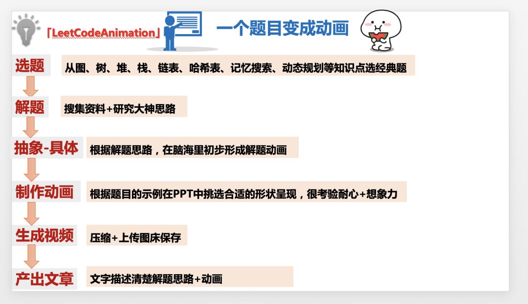 正如我在 「LeetcodeAnimation」上写的:我会尽力将LeetCode上所有的题目都用动画的形式演示出来,计划用3到4年时间去完成它,期待与你见证这一天!