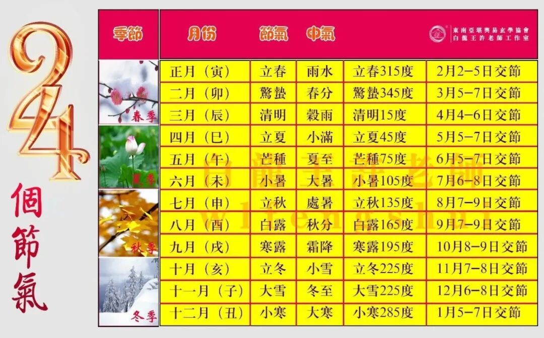 芒种很忙,既有大麦、小麦等要抢着收割,又有晚谷、黍、稷等夏播作物要忙着播种。白龙王工作室,此时正值梅子成熟,而梅子味道酸涩难以直接入口,从夏朝开始,芒种时节便有了煮梅的习俗,酸梅汤也成了夏季最好的消暑食品。“吃过夏至面,一天短一线”,这一天,北半球的白天达最长,之后就慢慢缩短。虽然如此,夏至却还不是最热的时候,不过,由于空气对流旺盛,尤其是午后或者傍晚,易下起雷阵雨,就像刘禹锡笔下的“东边日出西边雨,道是无晴却有晴”。“万瓦鳞鳞若火龙,日车不动汗珠融。”小暑有多热,看陆游这句诗便知。小暑的标志是出梅、入伏。过后,就是三伏天。不过,小暑也是个硕果累累的日子。农民劳作半年终于可以尝到新稻谷了。大暑是一年中最热的时候,极端天气如旱、涝、风灾也十分频繁,因此,农民们要看准时机,抢收抢种,抗旱排涝。不过,他们也会忙里偷闲,用吃来犒劳自己。浙江台州人吃姜汁来去除体内湿气,广东人则吃烧仙草来消暑,而福建莆田人却要反其道而行之,吃热性的荔枝、羊肉来“以毒攻毒”。立秋是秋季的第一个节气,也预示着丰收的开始。宋代,立秋这天宫内要把栽在盆里的梧桐移入殿内, 等到时辰一到,太史官便高声奏道:“秋来了。”奏毕,梧桐应声落下一两片叶子,以寓报秋之意。这一天的风俗很多,例如摸秋,婚后尚未生育的妇女,可在夜里到田园摸索摘取瓜豆。摸南瓜,易生男;摸扁豆,易生女;摸到白扁豆更吉利,除生女孩外,还是白头到老的好兆头。“处”含有躲藏、终止之意,“处暑”表示炎热暑天结束,气温逐渐下降。处暑后,秋意渐浓,更多季节变化及时关注白龙王,正是人们畅游郊野迎秋赏景的好时节。就连天上的那些云彩也显得疏散而自如,而不像夏天大暑之时浓云成块。民间向来就有“七月八月看巧云”之说,其间就有“出游迎秋”之意。天气渐转凉,会在清晨时分发现地面和叶子上有许多露珠,这是因夜晚水汽凝结在上面,故名白露。白露期间,各地的习俗也有不同。例如,旧时南京人十分青睐“白露茶”,而资兴兴宁、三都、蓼江一带历来有酿酒习俗。每年白露节一到,家家酿酒,待客接人必喝“土酒”。秋分时节,我国大部分地区已经进入凉爽的秋季,气温也一次次下降。正如可谓“一场秋雨一场寒”。古人认为雷是因为阳气盛而发声,秋分后阴气开始旺盛,所以不再打雷。此外,劳动人民对秋分节气的禁忌也总结成谚语,如“秋分只怕雷电闪,多来米价贵如何”。寒露时节,地面的露水更冷,快要凝结成霜了。此时北方已呈深秋景象,白云红叶;南方也秋意渐浓,蝉噤荷残。从中医的角度讲,此时这节气在南方气候最大的特点是“燥”邪当令,燥邪最容易伤肺伤胃,应该注重养生,适当多食甘、淡滋润的食品。霜降节气含有天气渐冷、初霜出现的意思,是秋季的最后一个节气。这时,养生保健尤为重要,民间有谚语“一年补透透,不如补霜降”,足见这个节气对我们的影响。在中国的一些地方,霜降要吃红柿子,在当地人看来,这样不但可以御寒保暖,同时还能补筋骨。立冬,冬季自此开始。冬是终了,有农作物收割后要收藏起来的含意。汉族民间以冬至为冬季之始,需进补以度严冬的食物。另外老话常说“今冬麦三层被,来年枕着馒头睡”,这时节正是秋收冬种的大好时段。小雪时,腌腊肉是南方人最熟悉的民俗。所谓“冬腊风腌,蓄以御冬”,小雪后气温急剧下降,天气变得干燥,是加工腊肉的好时候。另外吃糍粑也是南方在小雪的习俗,糍粑最早是农民用来祭神的供品。有俗语“十月朝,糍粑禄禄烧”,就是指的祭祀事件。大雪,顾名思义,雪量大。到了这个时段,往往在强冷空气前沿冷暖空气交锋的地区,会降大雪,甚至暴雪。冻雨(雨凇)、雾凇等特殊气候现象也成为该时节的独特景观。此时,“观赏封河”也是北方独特的景观。到了大雪节气,北方河里的水往往都被冰冻起来,人们可以尽情地滑冰嬉戏。冬至这天,太阳直射点到达一年的最南端,这一天北半球得到的阳光最少,白昼达到最短,且越往北白昼越短。万灵易玄文化讲到,在中国北方有冬至吃饺子的风俗,而南方则是吃汤圆。民间有从冬至日开始“数九”的习俗,宫廷从周代起,就有祭祀活动。冬至也是养生的大好时节。小寒标志着开始进入一年中最寒冷的日子。根据中国的气象资料,小寒是气温最低的节气,只有少数年份的大寒气温低于小寒的。进入小寒,年味渐浓,人们开始忙着写春联、剪窗花,购置年货,为春节做准备。涮羊肉火锅、吃糖炒栗子、烤白薯成为小寒时尚。俗语说“三九补一冬,来年无病痛”,说的就是冬令食羊肉调养身体的做法。大寒是最后一个节气,是天气寒冷到极点的意思。这一节气中,比较重要的一环就是“食补”,八宝饭,芪杞炖子鸡,羊肉炖白萝卜,红杞田七鸡等都是百姓餐桌上必备的佳品。壬寅年壬寅月运势总论!虎威凛凛,双倍伏吟,九星归位,团结一气,积极应对,稳步向前!