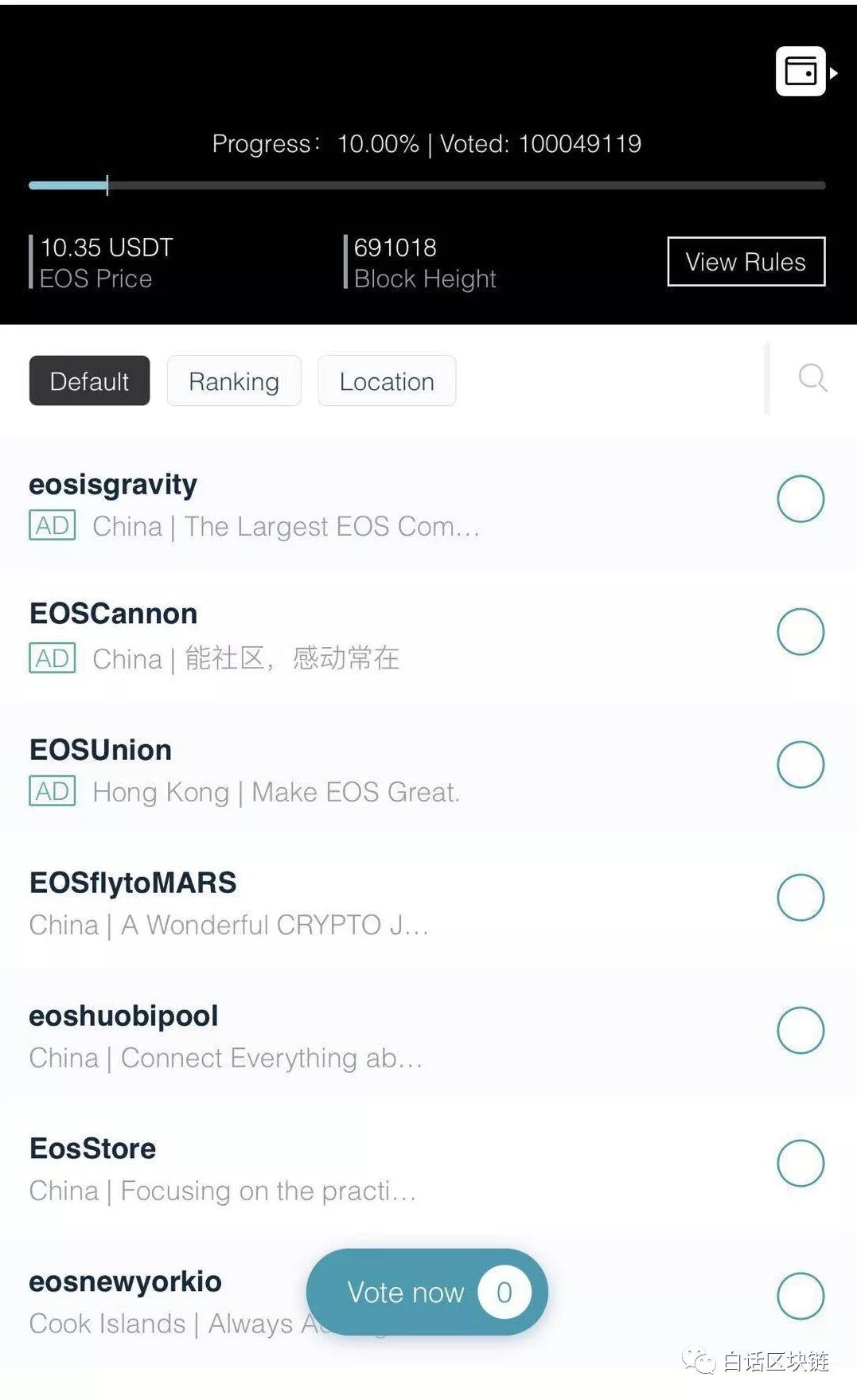 当投票率达到15%后,可以理解为主网启动成功,大概率成为社区唯一认可的EOS,获得票最高的前21个节点就是创始超级主节点了。