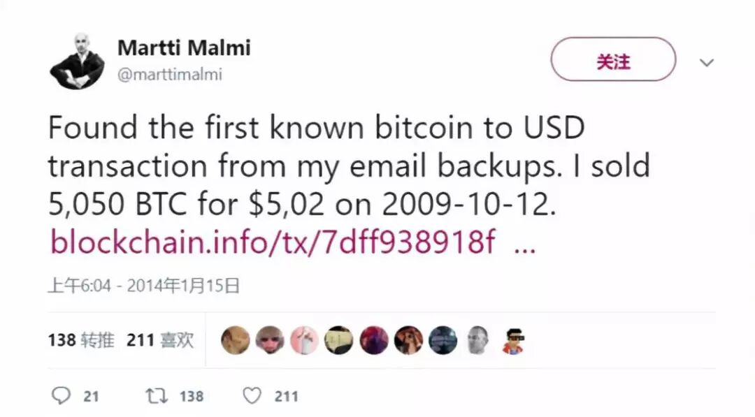 2009年10月12日,在New Liberty Standard上线该服务7天后,一个推特名为“MarttiMalmi”的用户,在该平台使用PayPal以5.02美元的价格,从Sirius处购买了5050枚BTC。按照当时的交易计算,第一枚比特币的价格应该是0.0001美元,而非2010年5月22日的0.0025美元。