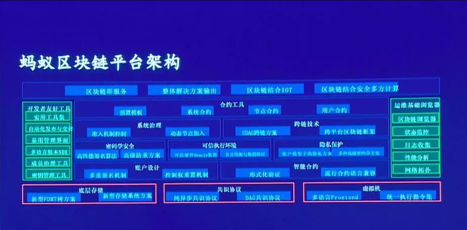 从蚂蚁区块链角度来看,我们还在达摩院建立了区块链实验室,争取在技术上有更大突破。下面,我们来看看蚂蚁区块链平台的架构图。