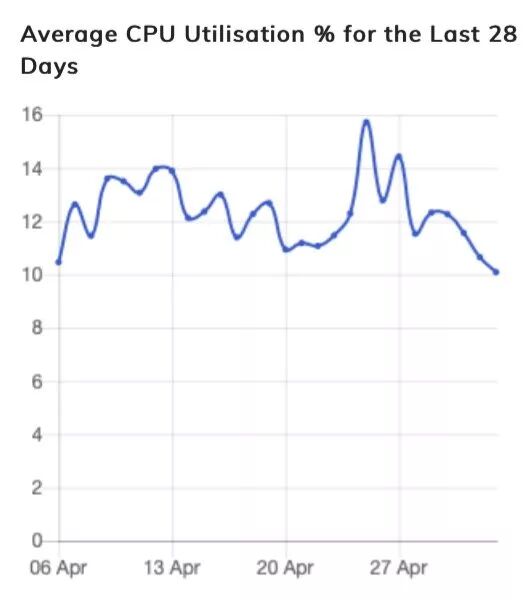 从上图中,我们可以看到,过去28天EOS CPU的使用率平均在13%左右,峰值也没超过16%。