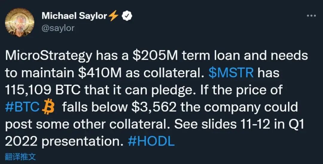 不过虽然目前的二级市场价格远远跌破了它的成本价,但根据 MicroStrategy 首席执行官 Michael Saylor 在 5 月份披露的信息,MicroStrategy 有 2.05 亿美元的定期贷款,需要维持 4.1 亿美元作为抵押品,而它有 115109 枚 BTC 可以质押,所以只有当比特币的价格低于 3562 美元,MicroStrategy 的比特币才可能面临清算。