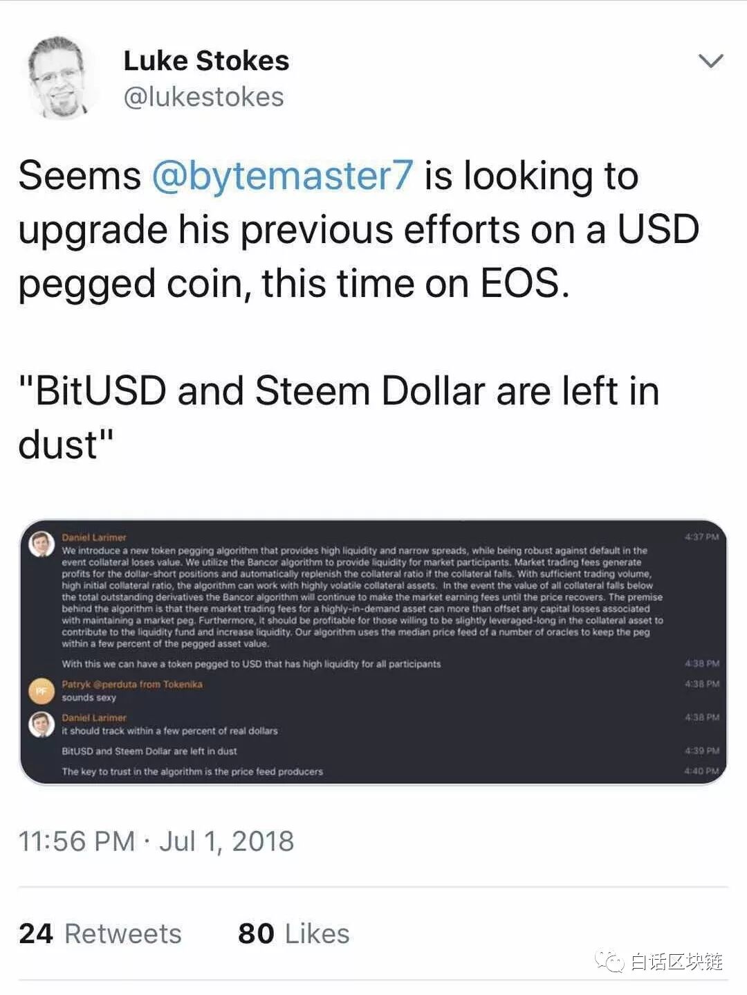 2018年7月初,就在整个币圈都在盯着FT的交易挖矿大战、EOS的内存暴涨、以及各路人马的网上互黑时,steem和eosDAC团队的Luke Stokes在推特上转发了一张图片,在图片中,BM在电报群里提出了自己想要在EOS主链上发布一种新的稳定币的设想。很少有人意识到,BM的这一举措,极有可能会掀起一场席卷整个行业的混战,尽管这并不是混战的原因,而更像是其即将开始的标志,但可以确定的是,他的这一计划,将会在已经剑拔弩张的形势上再添一把柴,从而引发一场行业的激战。