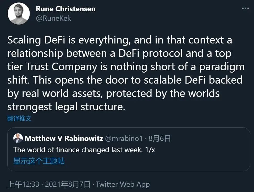 MakerDAO 创始人 Rune Christensen 在谈及现实世界资产支持的DeFi 时,就认为这是一种“范式转变”,称其为现实世界资产支持的可扩展 DeFi 敞开了大门,同时使 DeFi 受到了世界上最强大的法律结构的保护。