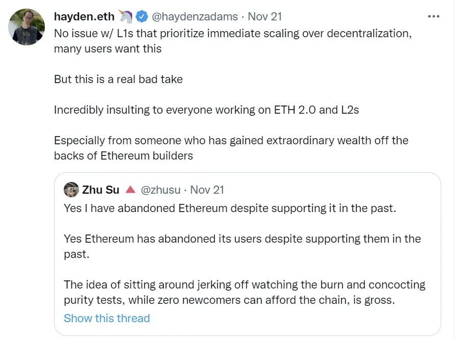 11月20日,三箭资本联合创始人Zhu Su因不满以太坊高昂的GAS费用,发推宣布弃用以太坊,他们认为以太坊高昂的手续费,已经不再适合新用户加入了。