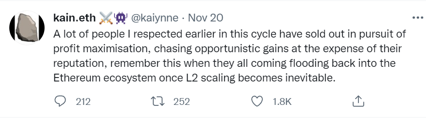 但他也认为这些人也会因为以太坊Layer2的成功,会在之后再次投奔以太坊生态圈。言语之间他可能批评的是三箭资本抛弃以太坊的做法无疑是投机主义者。