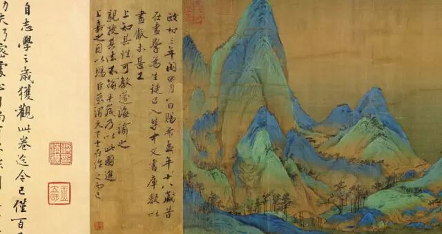 “政和三年闰四月一日赐王希孟十八岁,昔在画学为生徒,召入禁中文书库。数以画献,未甚工。上知其性可教,遂诲諭之,亲授其法。不踰半岁,乃以此图进,上嘉之,因以赐臣。”