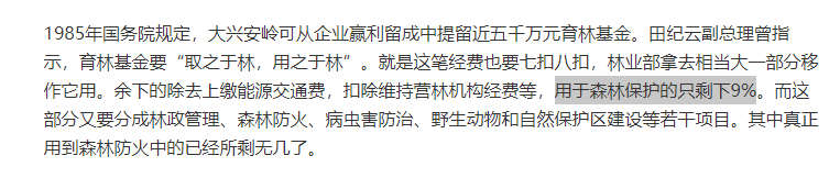 1,五千万育林基金,最后扣到用于森林保护的只剩下9%。